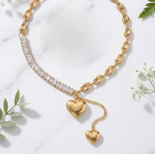 Gold Heart Charm Necklace with Zircon Studded Chain