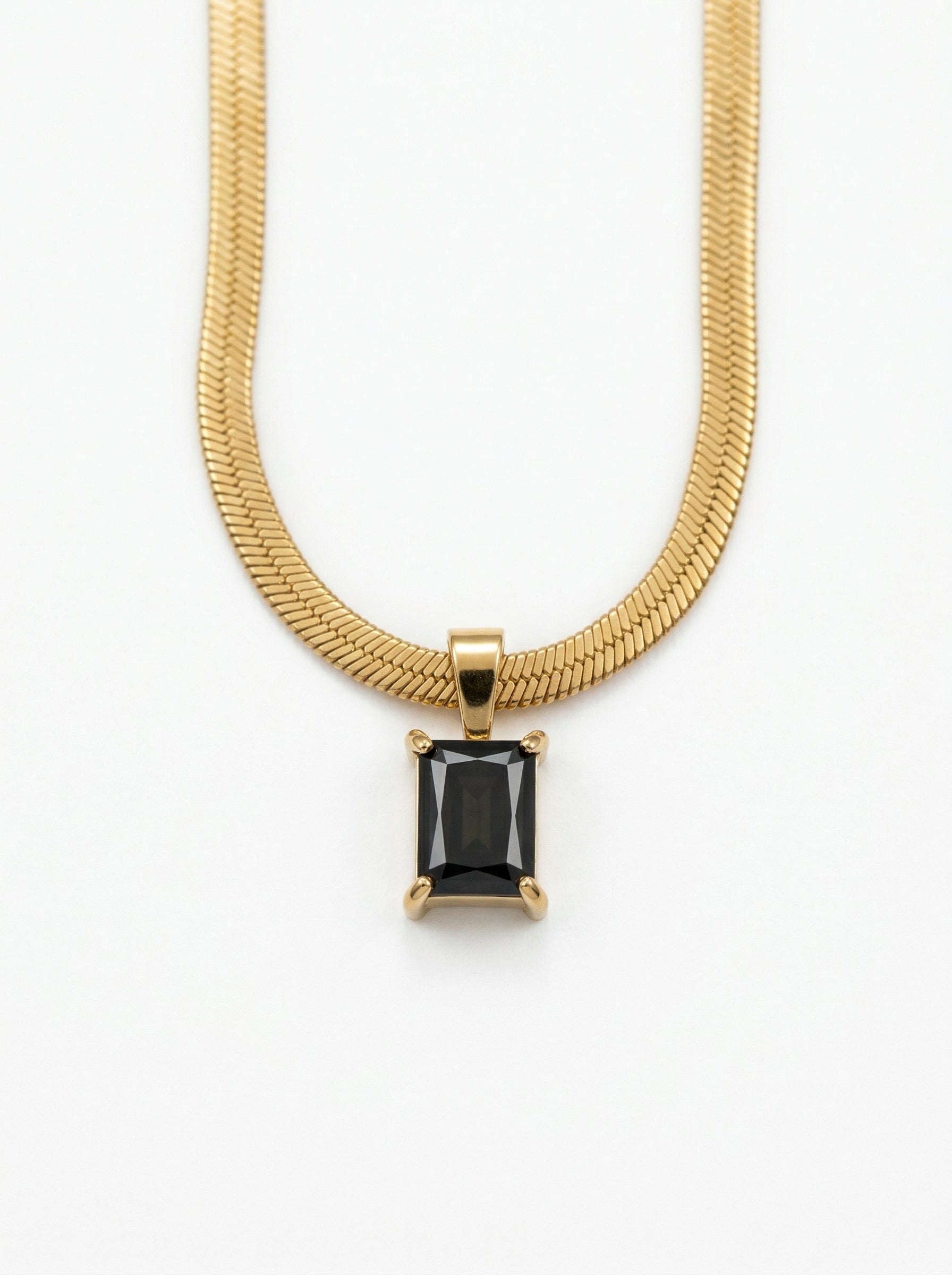Bold, sleek, and effortlessly refined — the Black Sapphire Pendant Chain features a deep black rectangular stone set on a smooth gold herringbone chain, creating a powerful yet minimal statement.