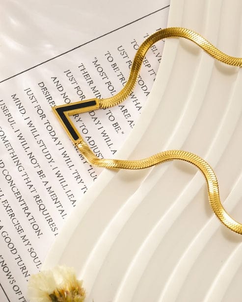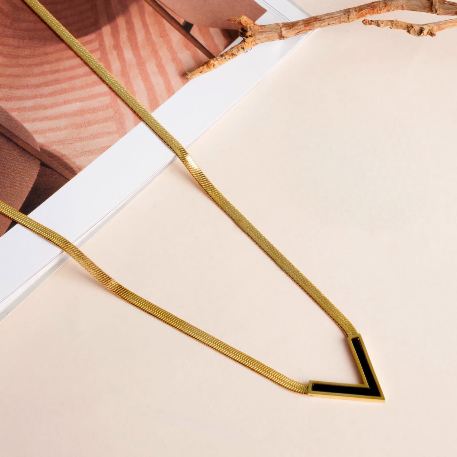 The Black V Bar Pendant Necklace is designed for those who love sharp lines and timeless contrast. Featuring a sleek black enamel V-shaped pendant paired with a flat gold snake chain, this piece adds instant sophistication to any look—day or night.