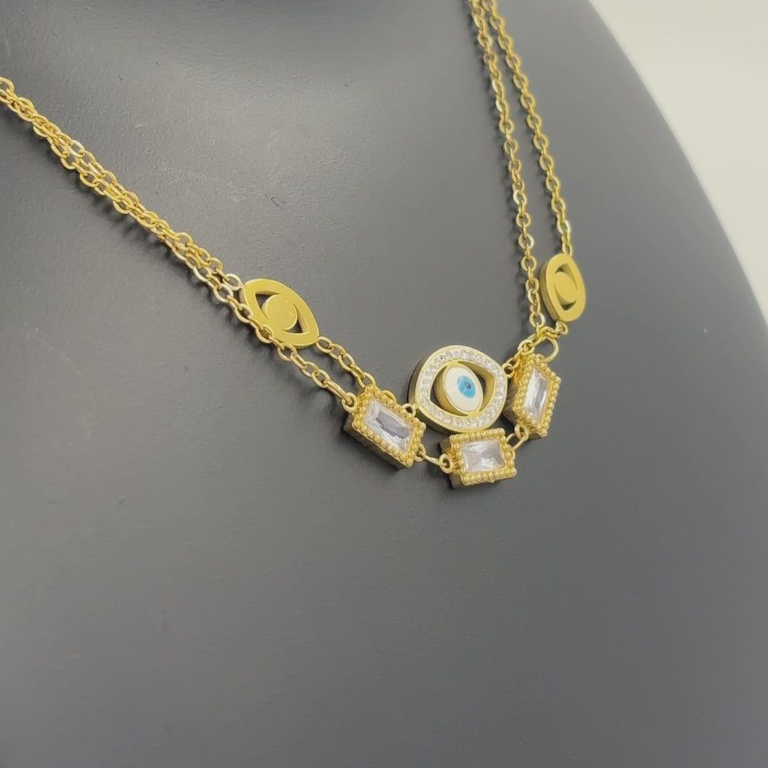Double Chain Diamond Evil Eye Necklace Gold Plated, Waterproof and Anti-Tarnish