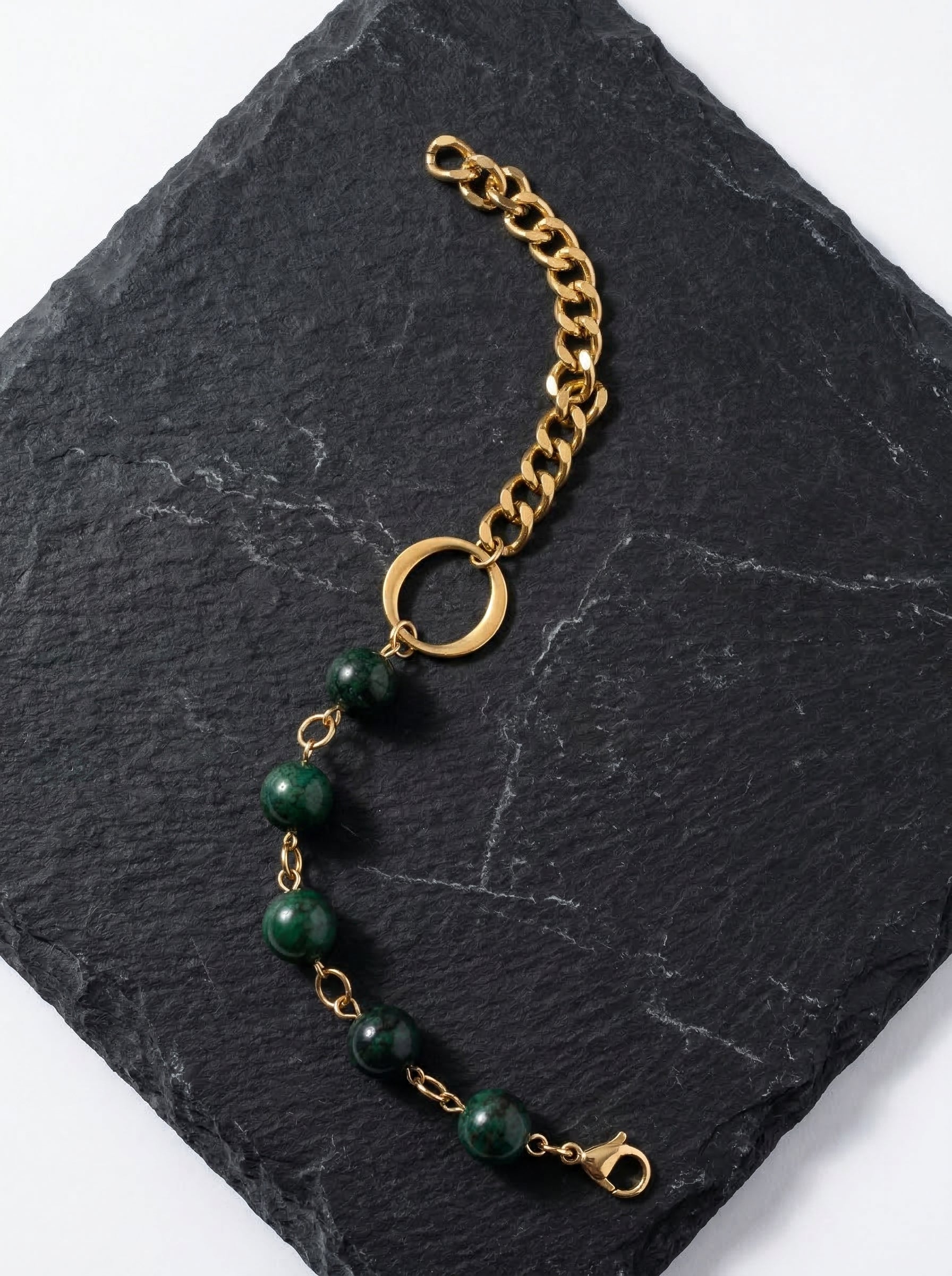 Featuring deep emerald green beads paired with a chunky gold chain and signature ring detail, this bracelet exudes richness and confidence. The contrast of textures and tones creates a powerful yet elegant look, perfect for elevating both day and evening outfits.