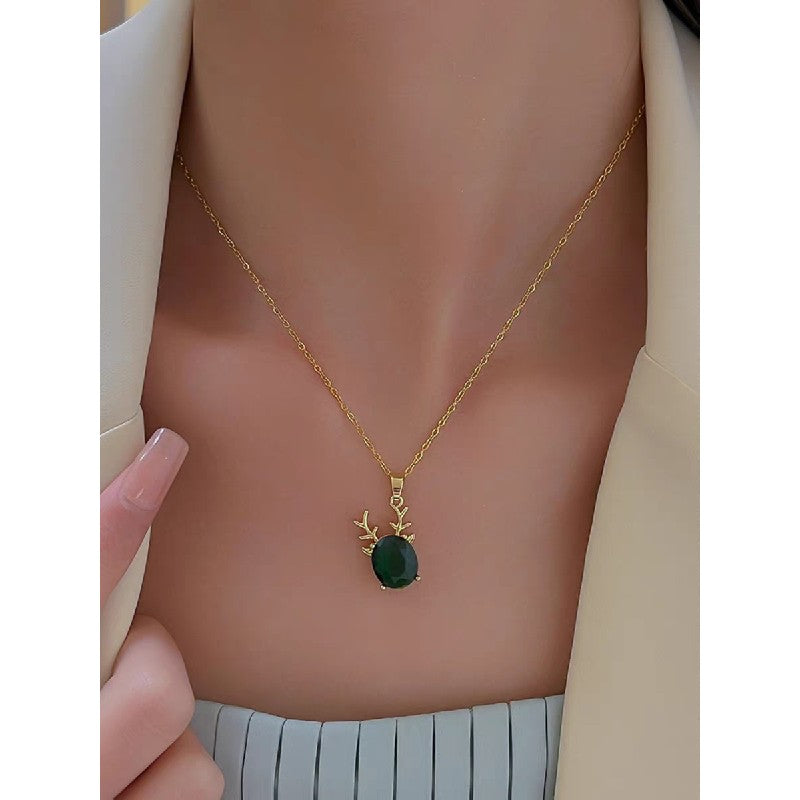 Add a touch of festive elegance to your look with this stunning Emerald Reindeer Pendant Necklace. Featuring a deep green oval gemstone set in a premium 18K gold-plated frame, the pendant is beautifully accented with delicate reindeer antlers — a perfect blend of luxury and holiday charm.