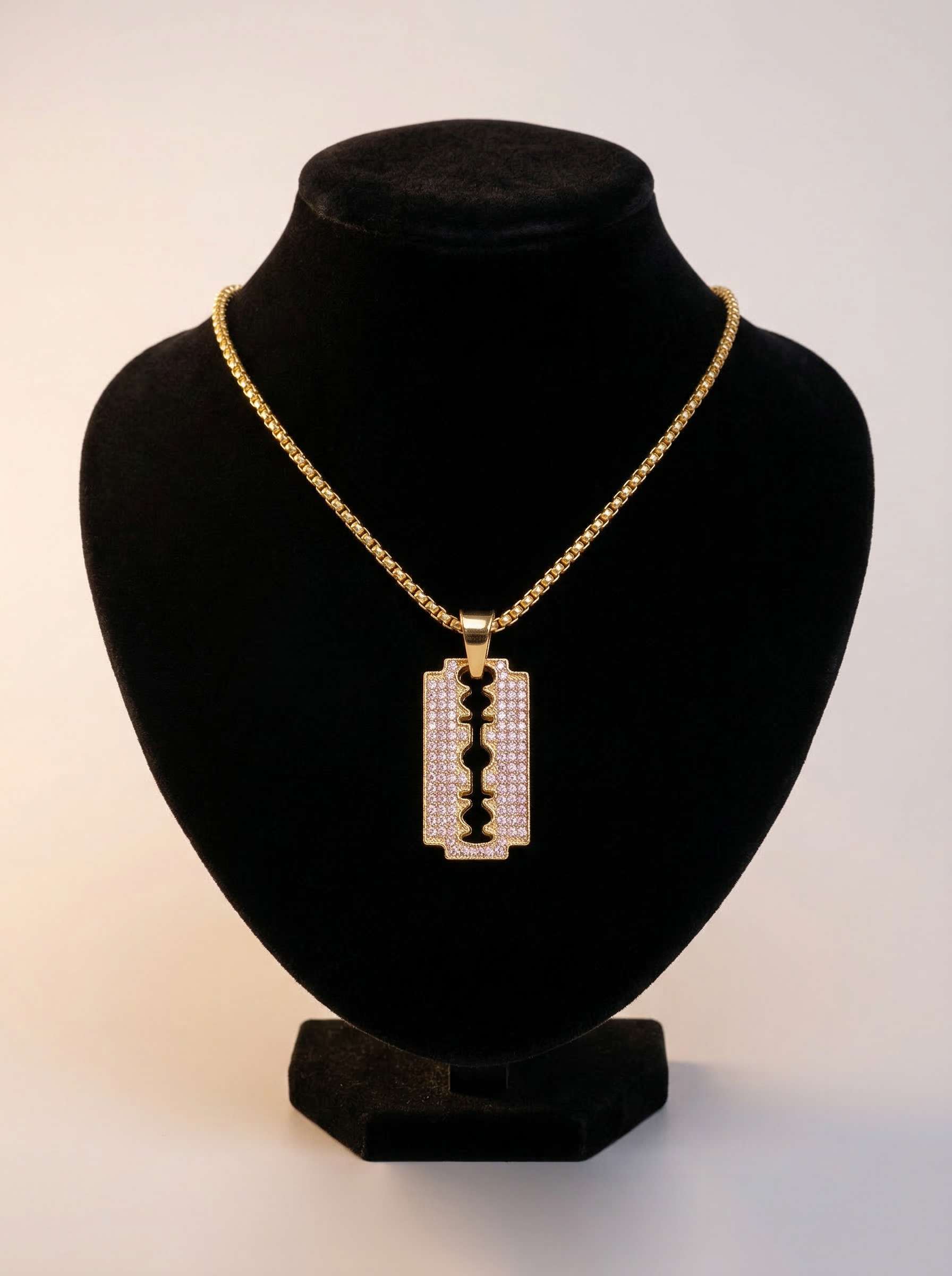 The Golden Iced Blade Pendant Chain is crafted for those who like their style with an edge. Featuring a razor blade-inspired pendant fully iced with high-shine stones, this piece delivers a perfect mix of streetwear attitude and luxury drip.