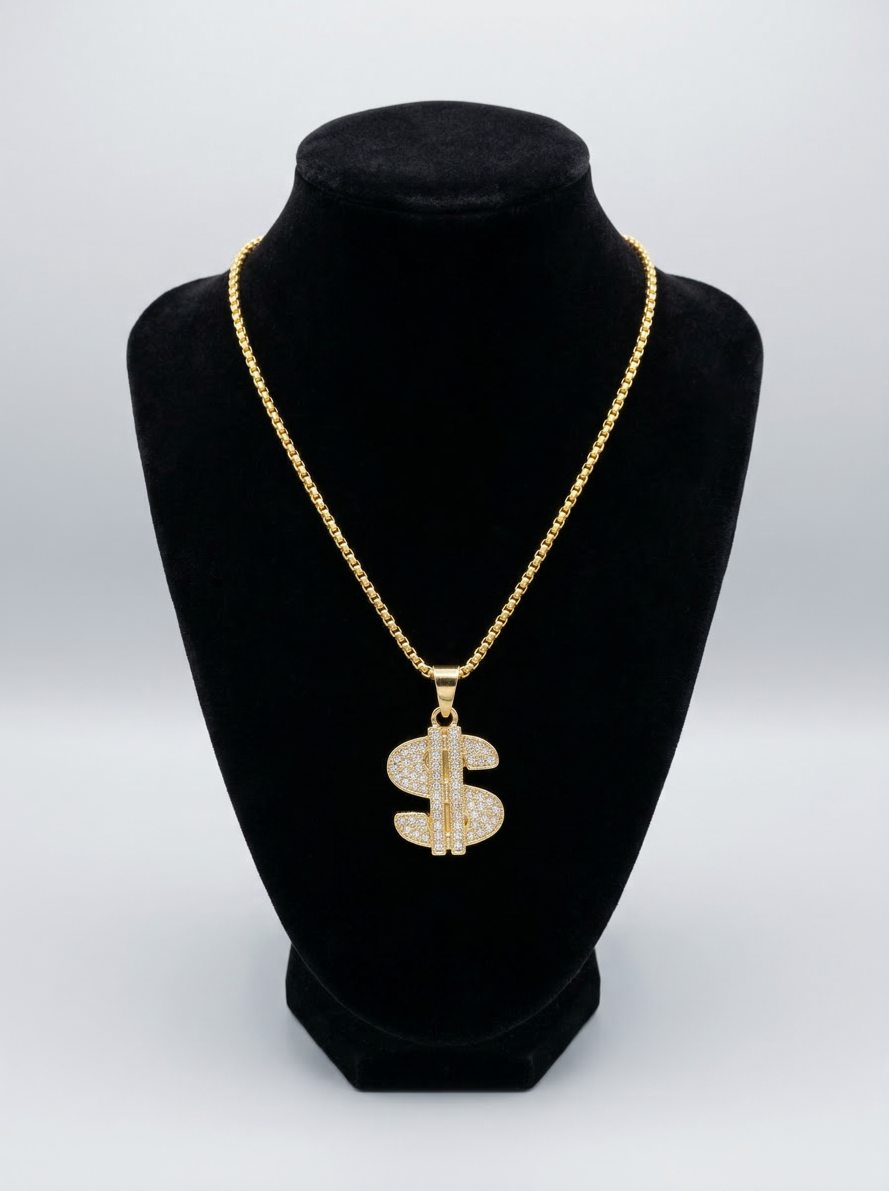 The Golden Iced Dollar Pendant Chain is designed for those who hustle hard and style harder. Featuring a bold dollar pendant fully iced with high-shine stones, this piece represents wealth, ambition, and confidence—all in one statement.