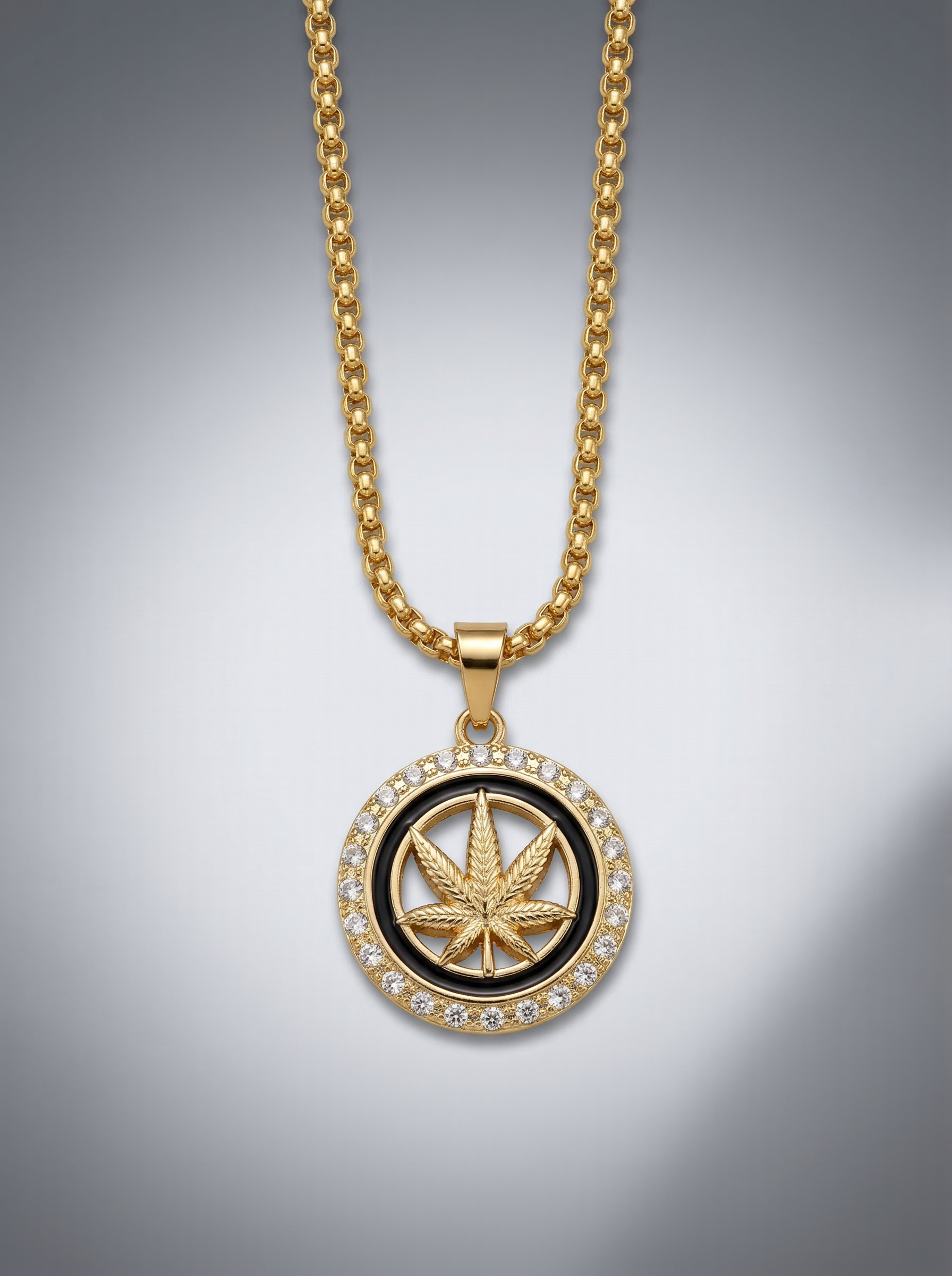 The Golden Iced Leaf Emblem Pendant Chain is designed for those who like their style unique and attention-grabbing. Featuring a detailed leaf emblem set inside a sleek circular frame with iced stone detailing, this piece delivers a perfect blend of streetwear edge and luxury shine.