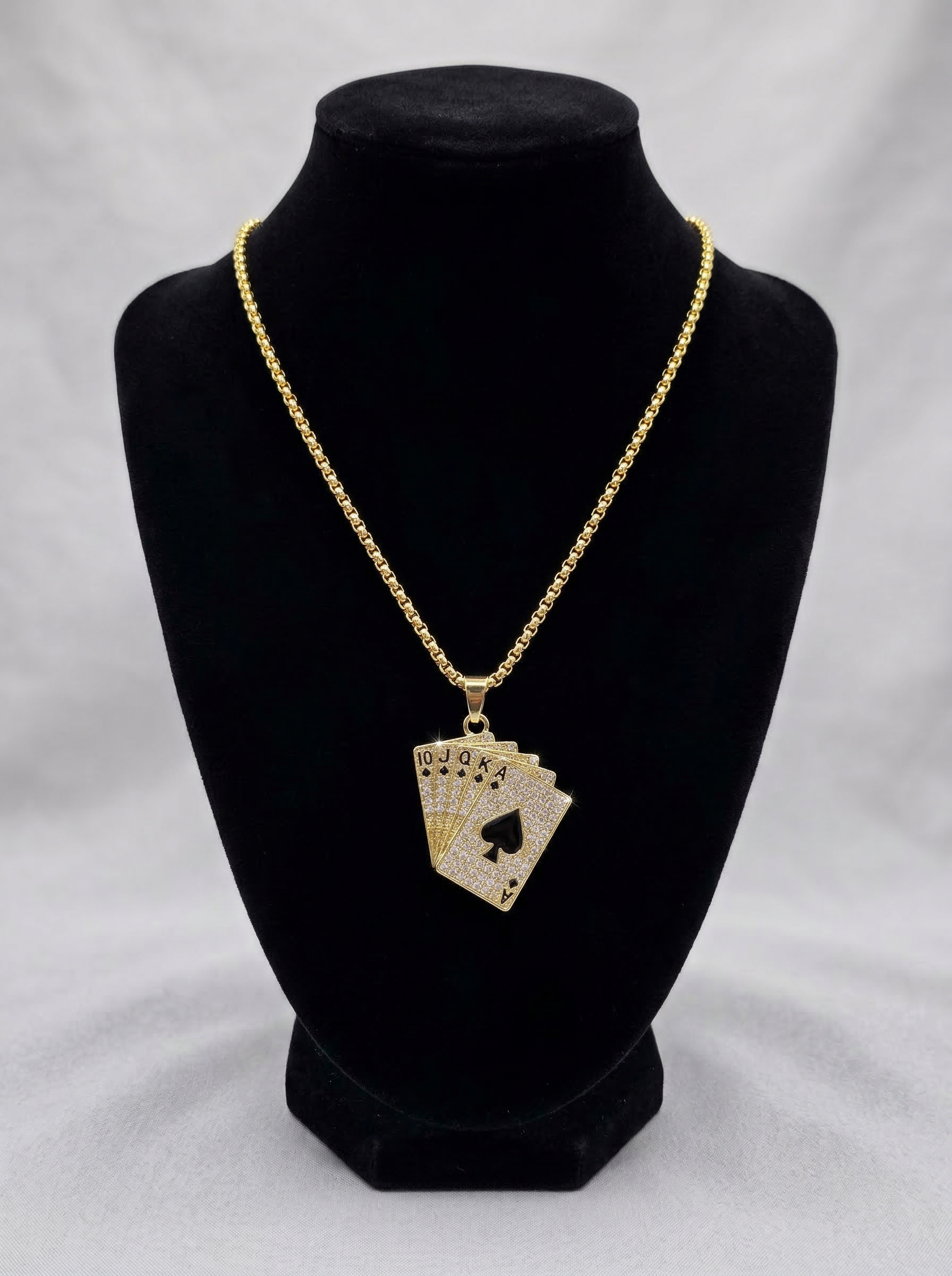 The Golden Iced Royal Cards Pendant Chain is designed for those who take risks and own the game. Featuring a stacked royal card design (Ace, King, Queen, Jack) with premium stone detailing, this pendant represents power, luck, and winning energy.