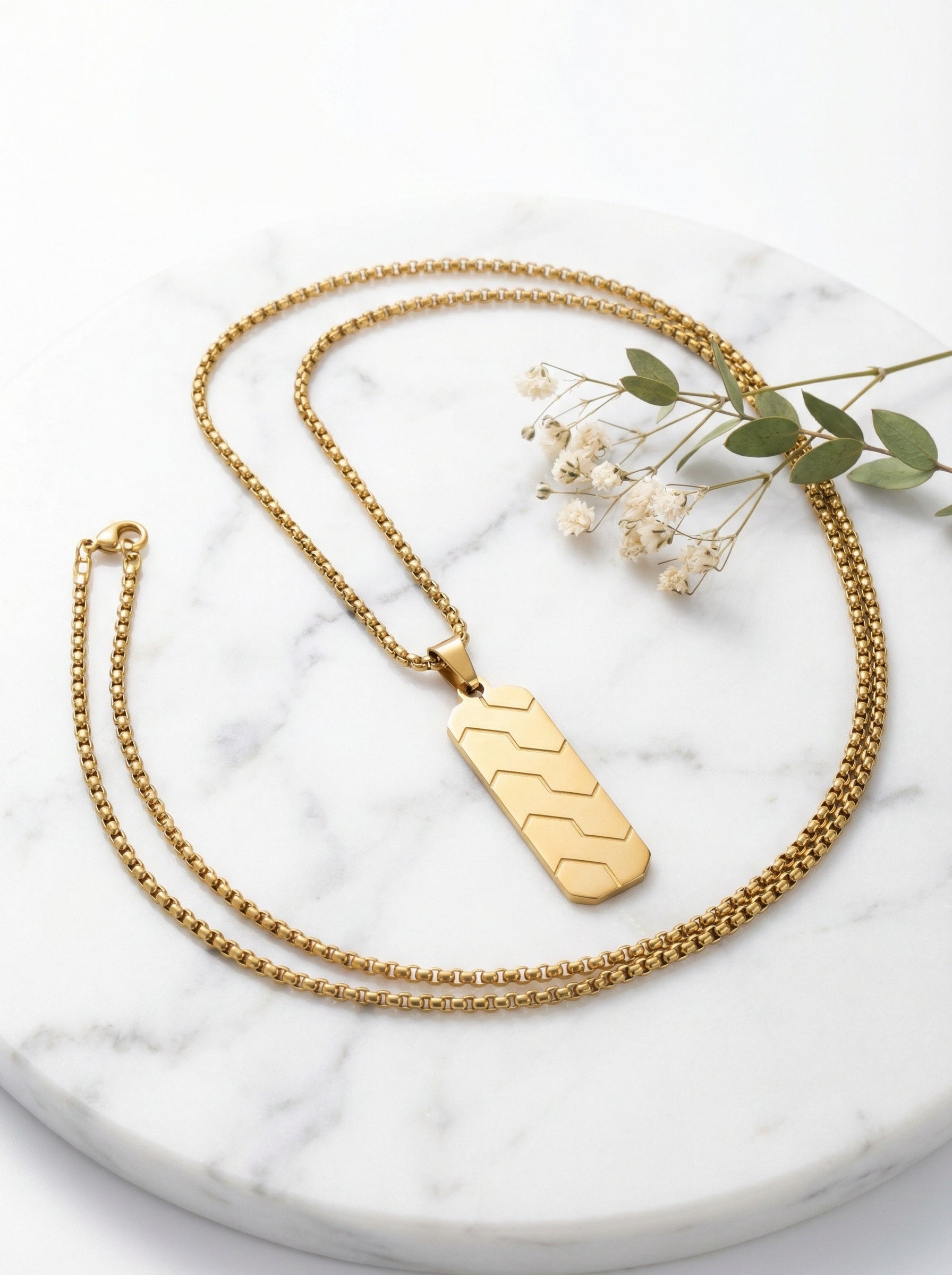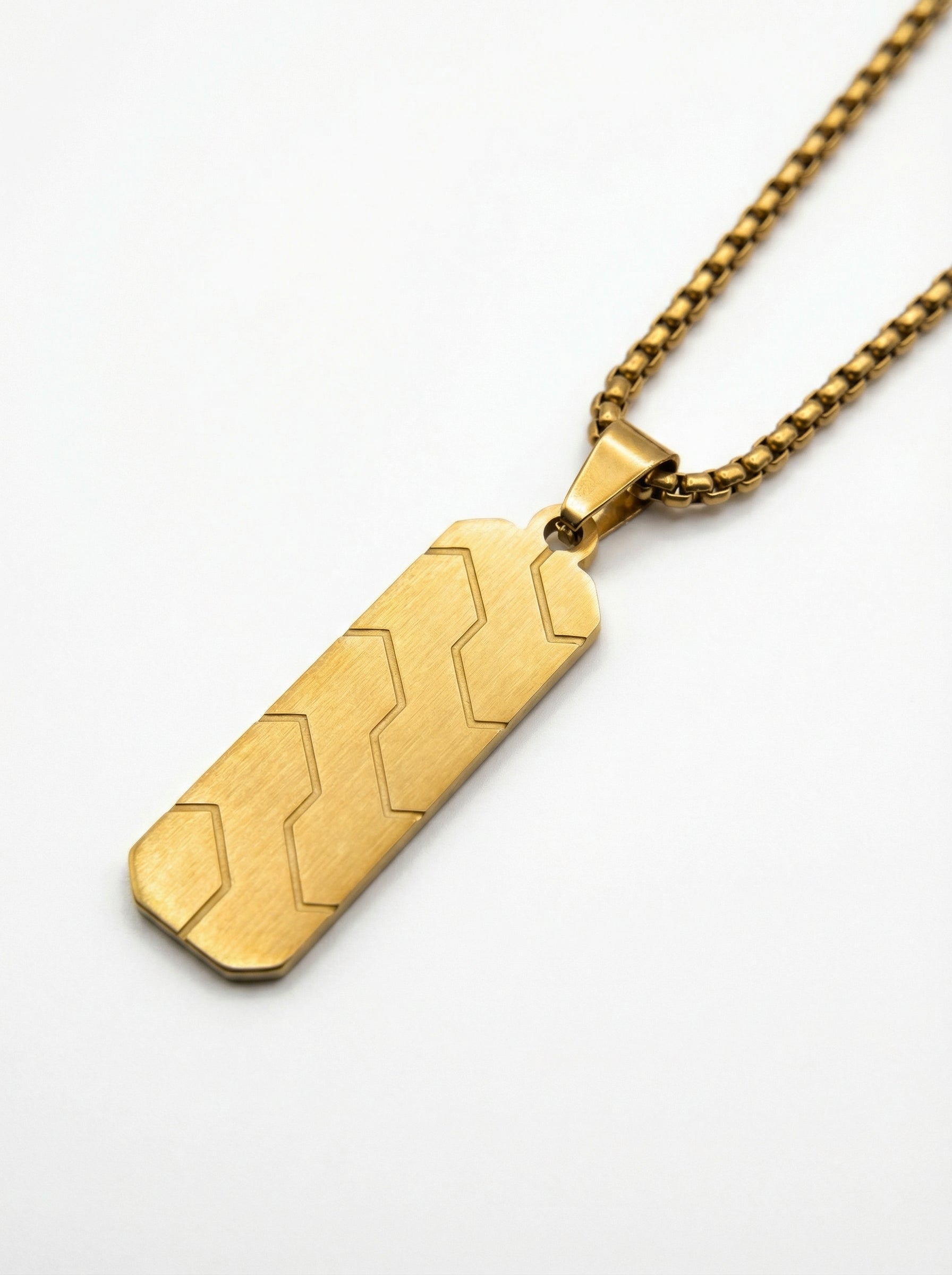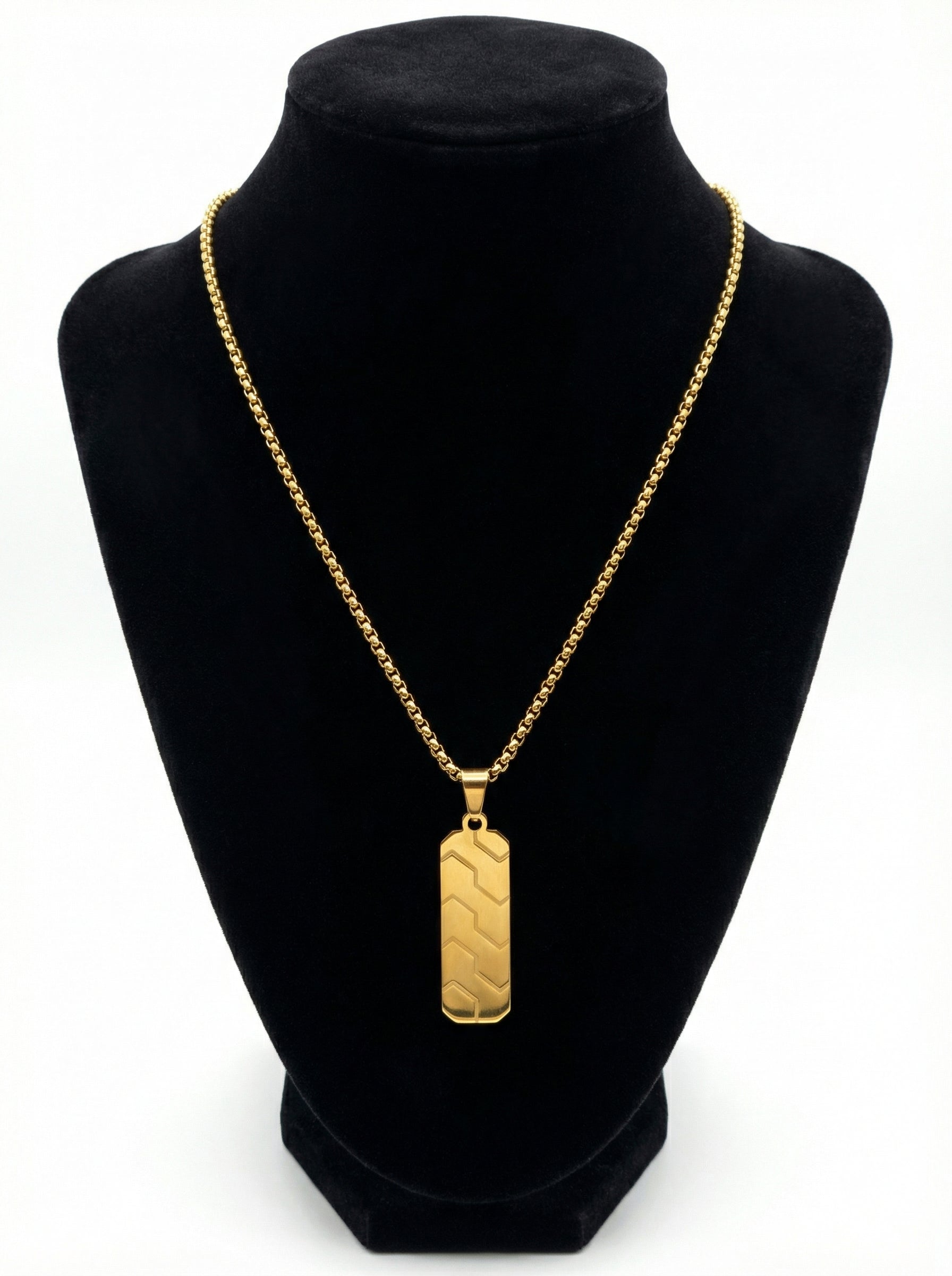 Make a powerful style statement with this Luxury Gold Geometric Bar Pendant Necklace. Featuring a premium gold-plated finish with modern engraved detailing, this pendant delivers a bold, high-end look inspired by luxury fashion.