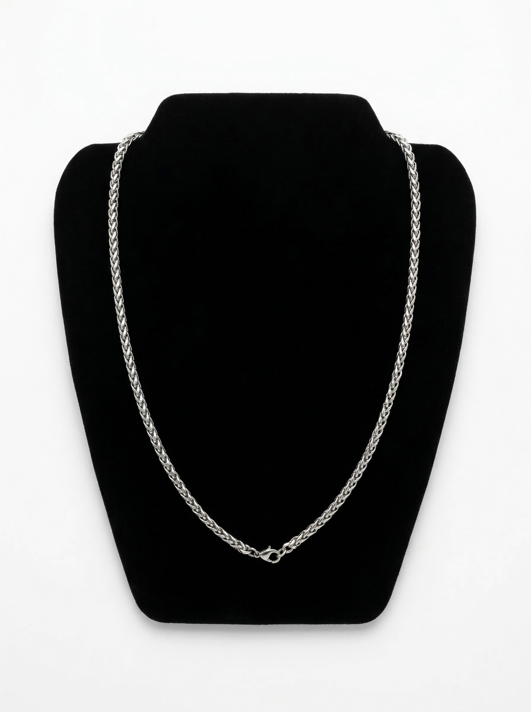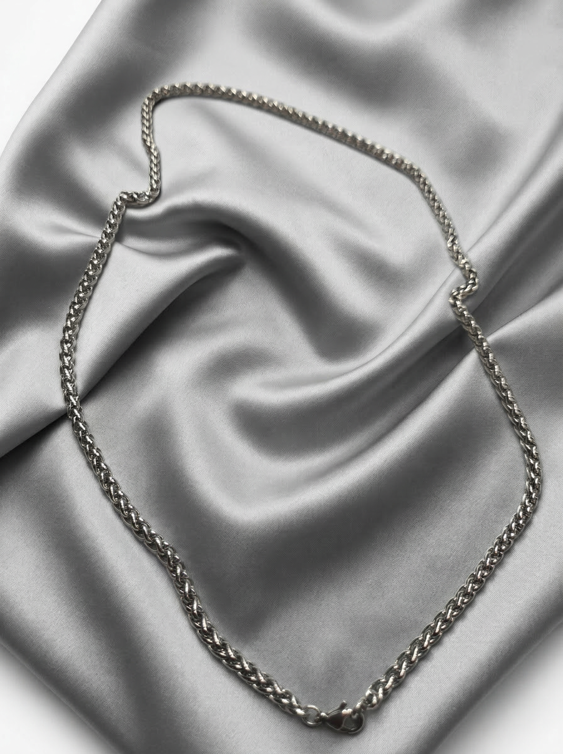Add a touch of refined simplicity to your style with the Silver Wheat Chain. Designed with an elegant wheat-style weave pattern, this chain features tightly interlocked links that create a smooth, symmetrical texture with a premium polished finish.