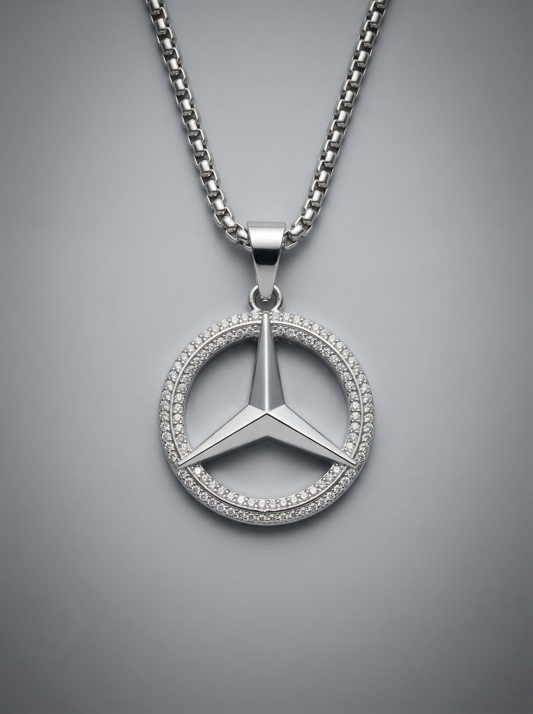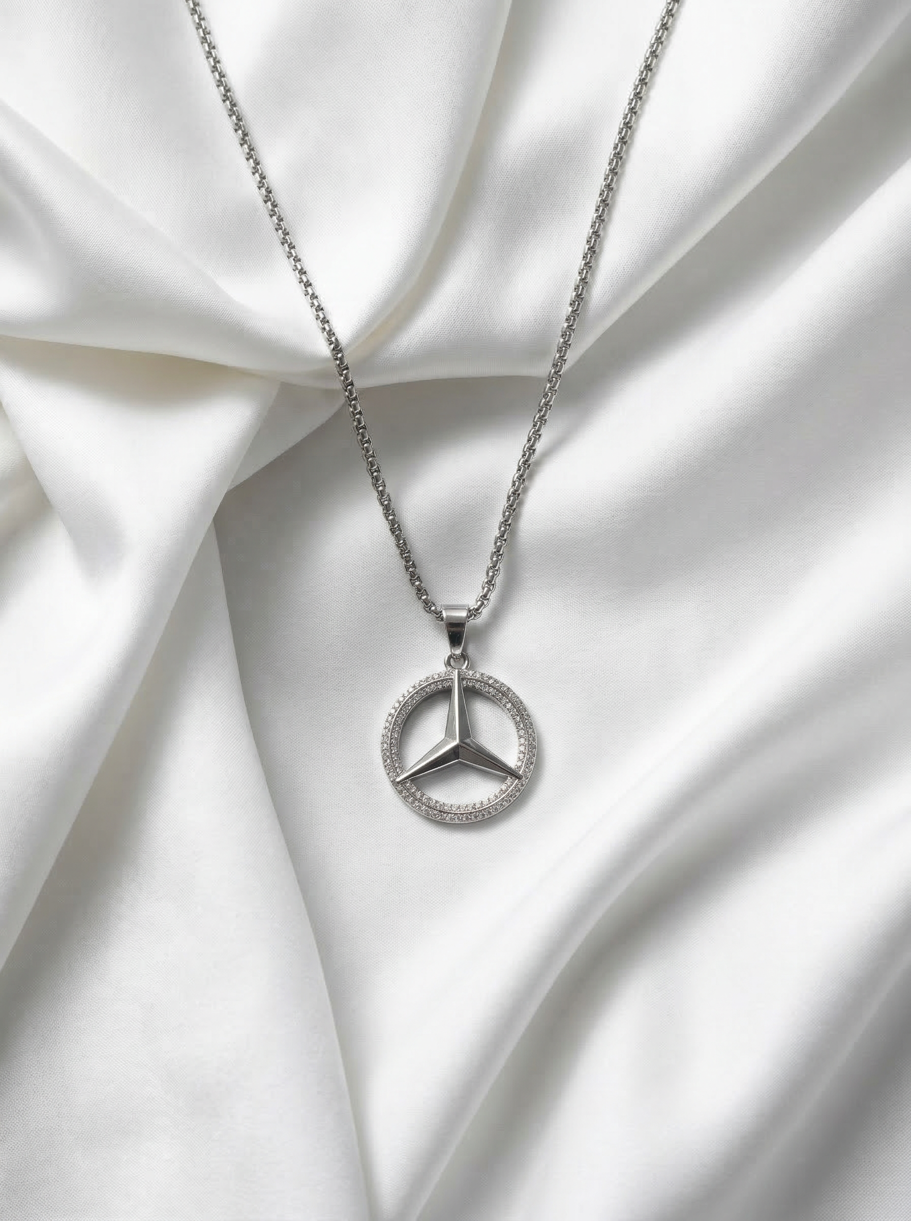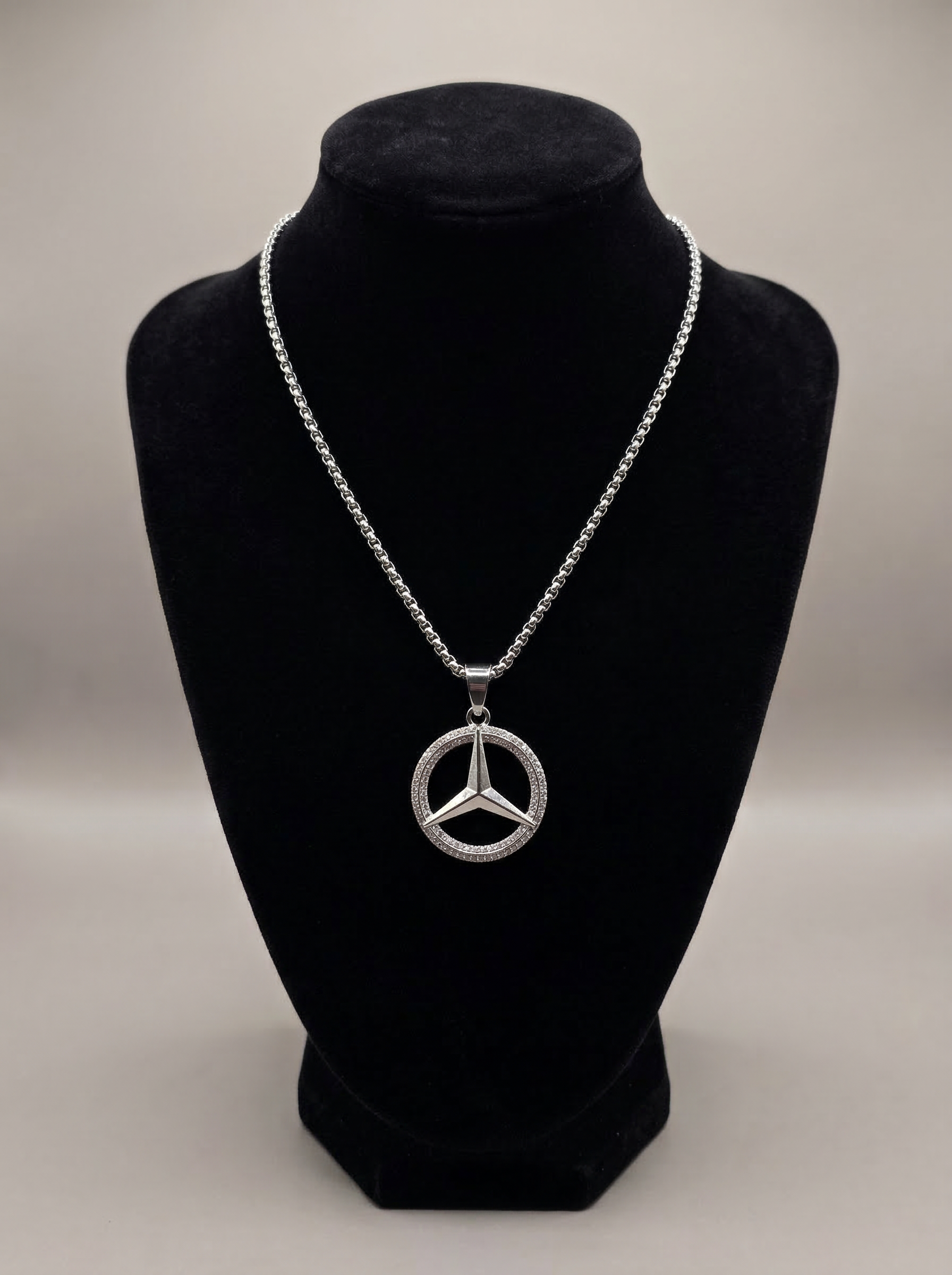 The Silver Iced Star Wheel Pendant Chain is crafted for those who like their accessories clean, bold, and impactful. Featuring a sharp three-point star enclosed within a fully iced circular frame, this piece delivers a luxury-inspired design with a modern edge.
